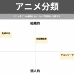 アニメを思想的に分析するとき、上の図のような軸で比較し分類すると、効果的だ。 それぞれの軸の両端には、対照的な属性が置かれている。 「組織的」と対照的なのが、「個人的」であり、「普遍的」と対照的なのが「時代的」である。 以下、それぞれの属性について詳しく説明する。 目次 1 組織的・個人的1.1 組織的とは1.2 個人的とは1.2.1 ①自己拡大系1.2.2 ②ぼっち系 […]