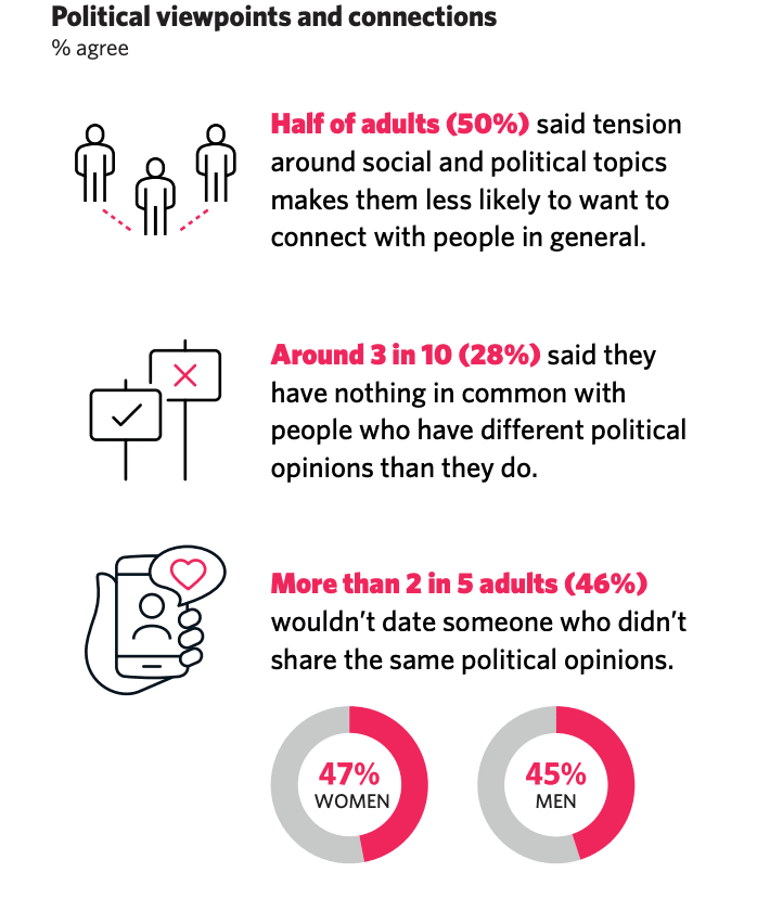 ・半分の人が社会的・政治的話題の緊張が、人との関わりを躊躇わせる