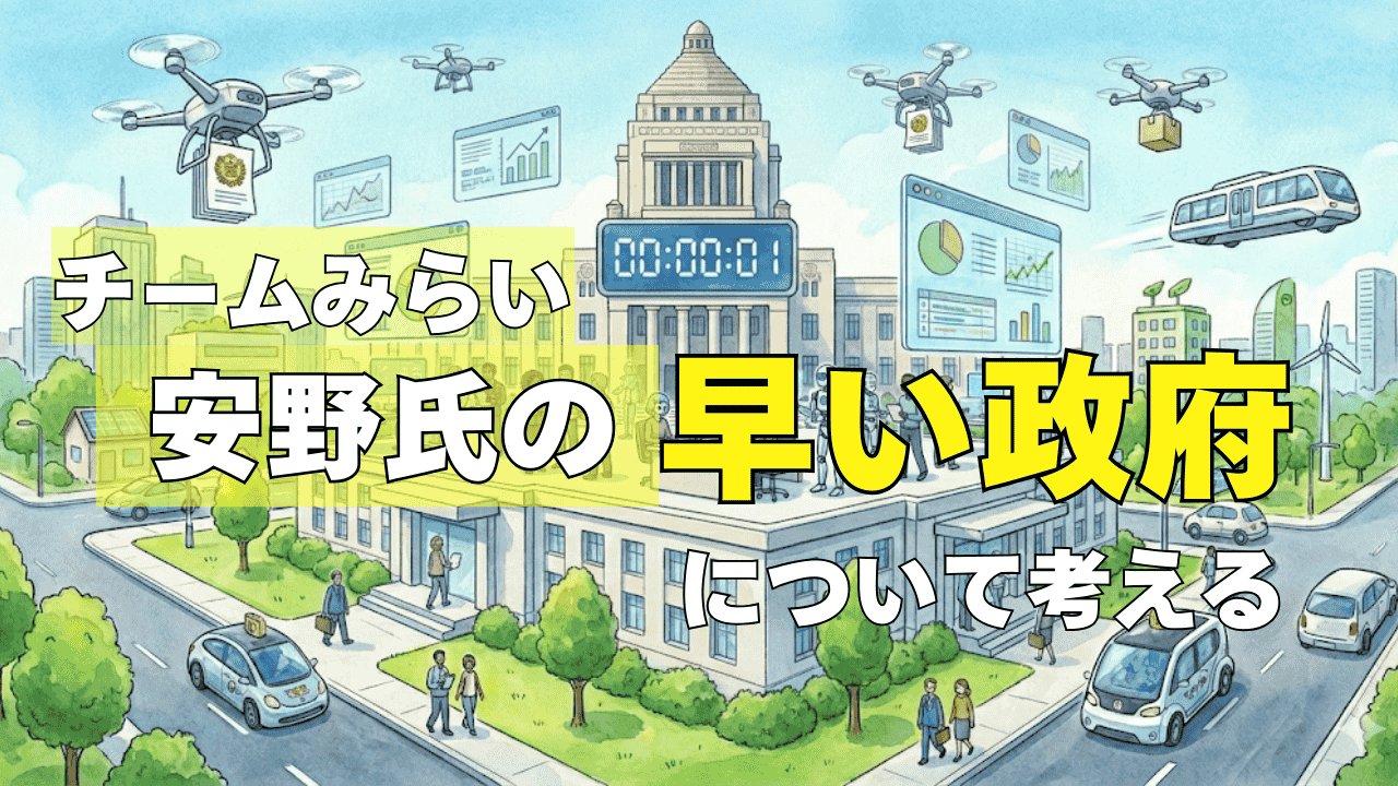政党のチームみらい・安野たかひろ党首が、インタビューにおいて、「早い政府」を目指すと主張していた。